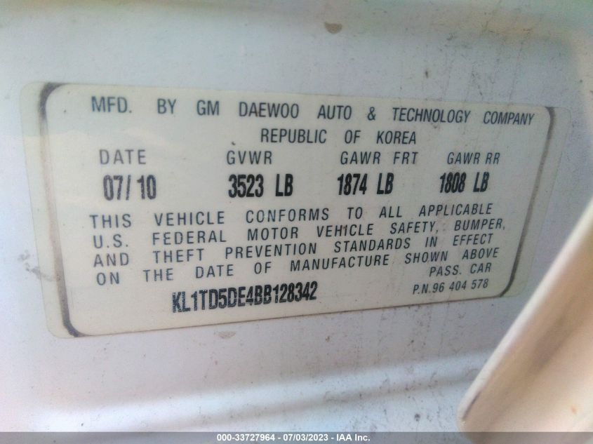 | VIN | KL1TD5DE4BB128342 |
